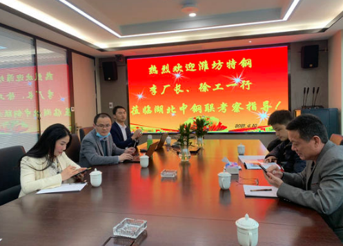 2021年4月11日山东潍坊特钢厂长李炳亮及工程师徐培升一行2人到中钢联考察、调研。受符乃良董事长的委派,我司销售副总经理沈燕、董事长助理刘助理负责接待。