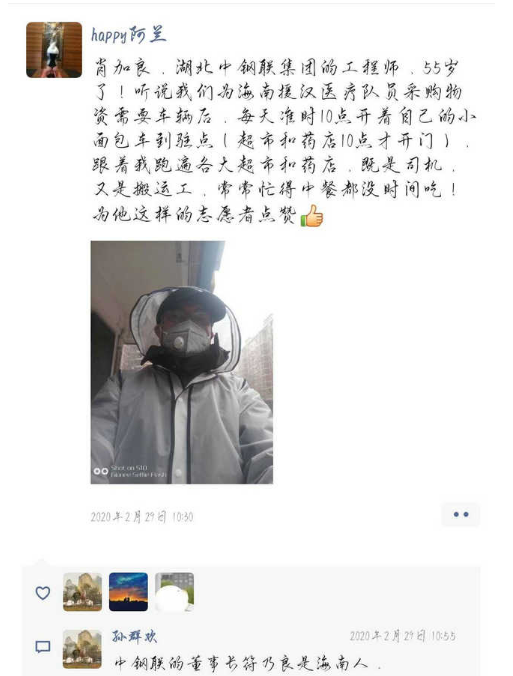 肖加良,湖北中钢联机械制造厂厂长,在公司算比较年长,已经55岁了,听说区工商联组织人员保障海南省援汉医疗队,保障队缺司机和车辆,他二话不说就带车加入保障队伍,从2月5日开始一直到上周,每天开着自己的面包车辗转各大超市、药店和医疗队驻地,既当司机又当搬运工,有时候忙的饭都顾不上吃,还要时刻做好防护和消毒工作,我们要为他的行为点赞。